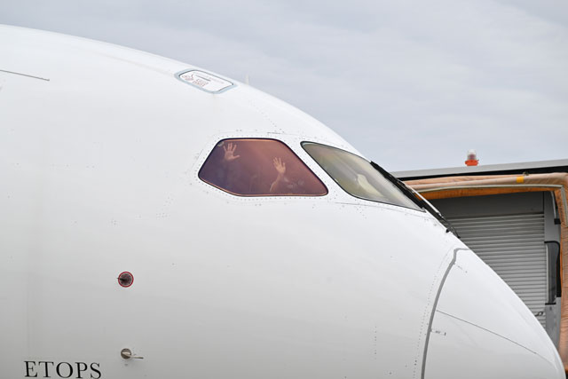 成田空港を出発するZIPAIRのヒューストン行き初便ZG16便のコックピットから手を振るパイロット=25年3月4日 PHOTO: Tadayuki YOSHIKAWA/Aviation Wire