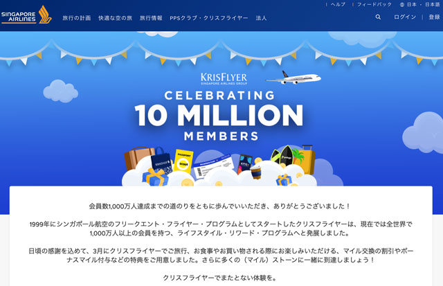クリスフライヤー会員1000万人突破キャンペーンを実施しているシンガポール航空