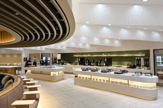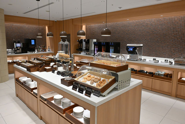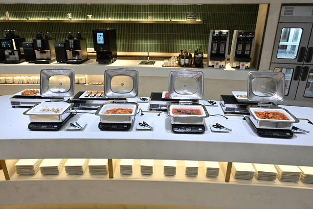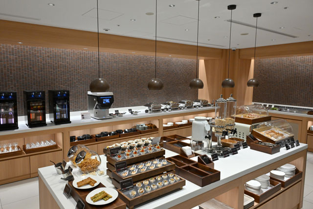 関空の国際線新ラウンジ「KIX Lounge Kansai」のサウスサイドにあるビュッフェカウンター=25年3月15日 PHOTO: Tadayuki YOSHIKAWA/Aviation Wire