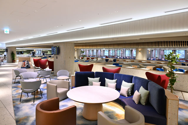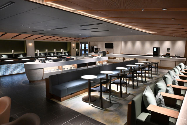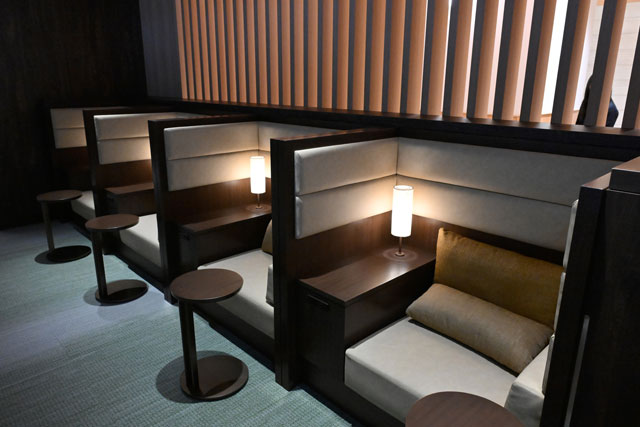 メインのラウンジとなるKansaiは、面積が約2970平方メートルで、席数は658席。運航便がある時間帯は営業する「フルフライト対応」で、ビュッフェやシャワールーム、授乳室、通話ブース(8つ)、オンラインミーティング用ブース(2つ)、ファミリールーム、プライベートルーム(3室、各10席)、喫煙室、複合機、ロッカー(60個)、マッサージチェア(2台)、Wi-Fiによる無線インターネット接続サービスなどを提供する。