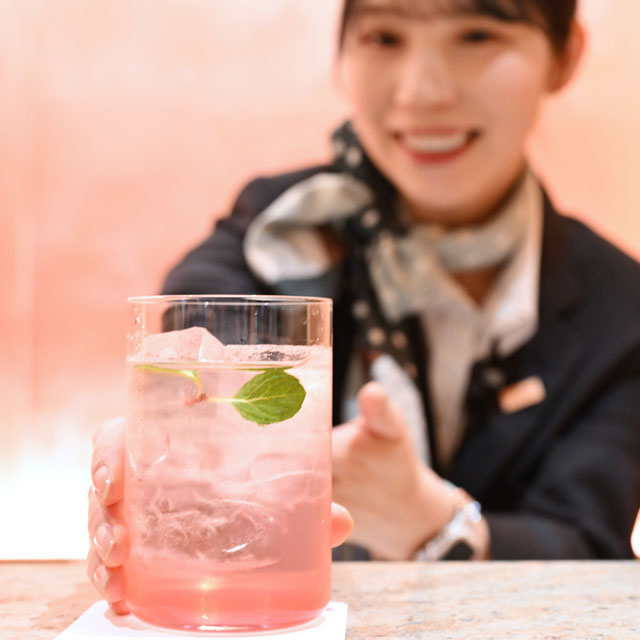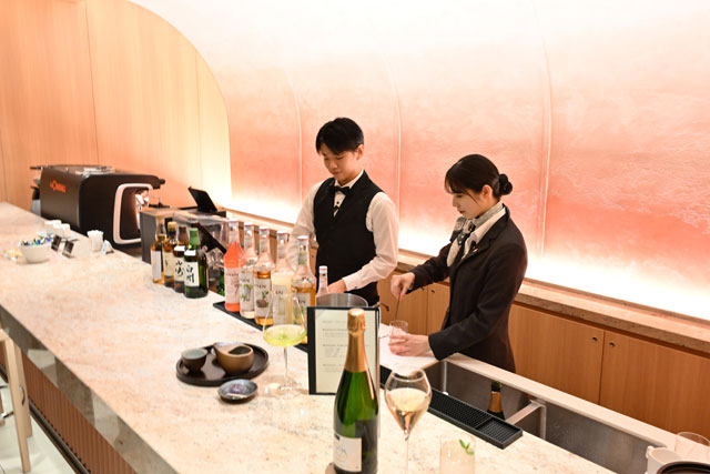 関空の国際線新ラウンジ「KIX Lounge Premium」のバーカウンターで提供するカクテル=25年3月15日 PHOTO: Tadayuki YOSHIKAWA/Aviation Wire