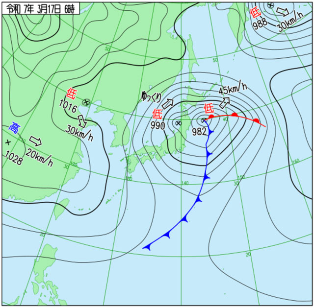 気象庁によると、発達中の低気圧が日本の東にあり、北東へ進んでいる影響で、3月17日は北日本では交通障害や大雪に警戒し、北日本と九州北部地方では暴風や高波、北海道地方では高潮に警戒するよう呼びかけている。航空各社では、北海道・東北方面の一部便に欠航が出ており、全日本空輸(ANA/NH)と日本航空(JAL/JL、9201)の大手2社だけで17日は国内線58便の欠航が決定。計3513人に影響が出る見通し。