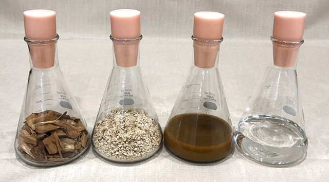 純国産SAFの原料となる(左から)木材チップ、パルプ、発酵培養液、バイオエタノール(JAL提供)