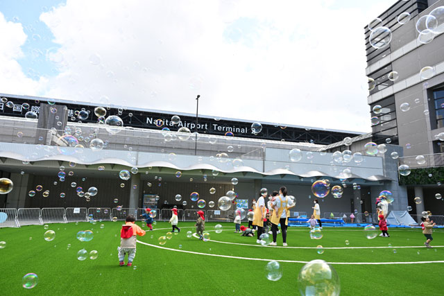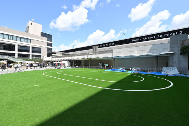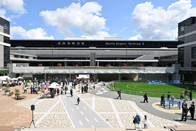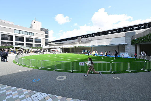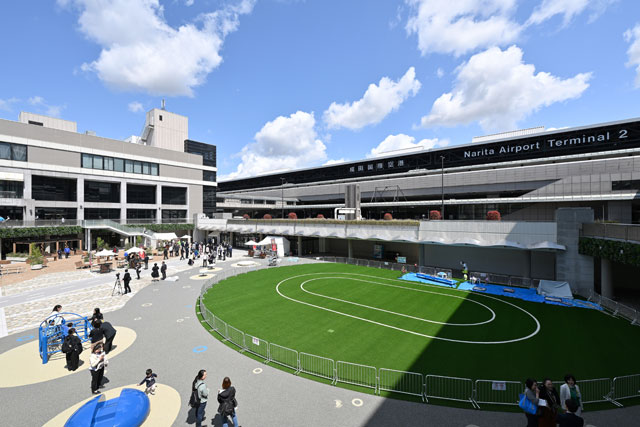 成田空港を運営する成田国際空港会社(NAA)は4月4日、第2ターミナルに隣接する第2駐車場ビル前の中央広場を「NRT Central Square Popo Park(ナリタ セントラル スクエア ポポ パーク)」にリニューアルし、オープニングセレモニーを開いた。空港スタッフの子育て支援を強化し、隣接する保育ルーム「たんぽぽ」の園児向けに広い専用園庭を整備した。