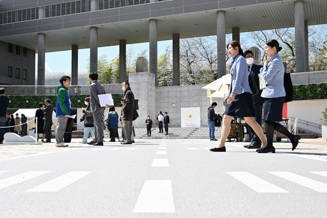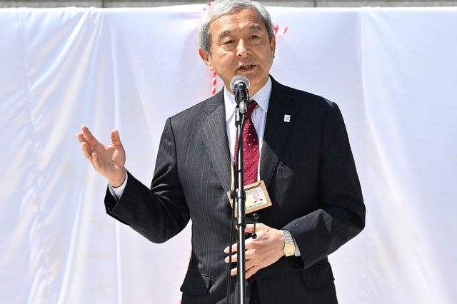 成田空港「Popo Park」のオープニングセレモニーで挨拶するNAAの田村明比古社長=25年4月4日 PHOTO: Tadayuki YOSHIKAWA/Aviation Wire