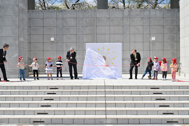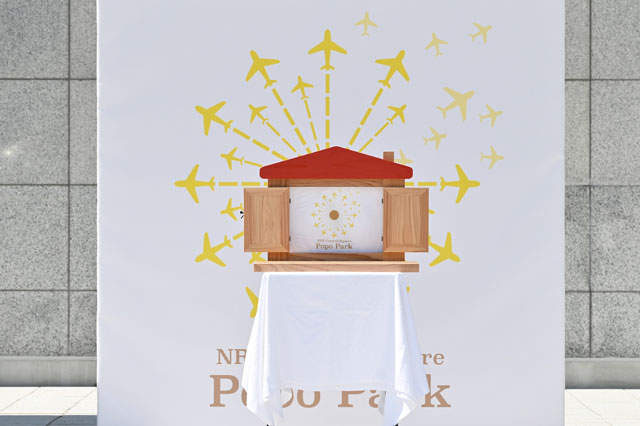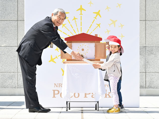 式典では、NAAの田村社長と田邉誠常務、一般財団法人成田国際空港振興協会の川島栄治理事長、たんぽぽの園児によるロゴの除幕式が開かれ、田村社長から園児へ紙芝居台と紙芝居がプレゼントされた。NAAによると、紙芝居台は成田空港の機能強化整備で伐採された木を使って製作されたという。