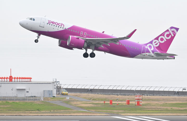 中部空港を離陸するピーチのソウル金浦行き初便MM747便=25年4月10日 PHOTO: Tadayuki YOSHIKAWA/Aviation Wire
