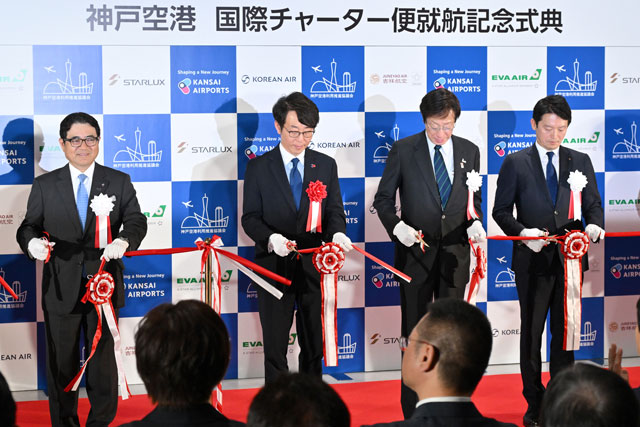 神戸空港第2ターミナルで開かれた国際チャーター便就航記念式典でテープカットする神戸市の久元喜造市長(右から2人目)ら=25年4月18日 PHOTO: Tadayuki YOSHIKAWA/Aviation Wire