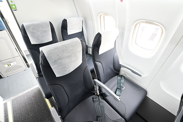 シートピッチが32インチで通常より広いトキエアの3号機ATR42の前方席=25年4月24日 PHOTO: Daigo TAKENOBU/Aviation Wire