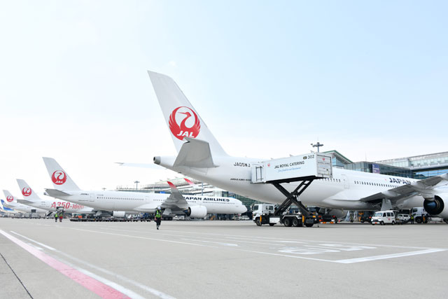 羽田空港の114番から111番スポットに並ぶJALのA350-1000。(手前から)5号機JA05WJのダラス行きJL12便、8号機JA08WJを投入するニューヨーク行きJL6便、初号機JA01WJのパリ行き初便JL45便、6号機JA06WJで運航するロンドン行きJL43便=25年5月1日 PHOTO: Yusuke KOHASE/Aviation Wire