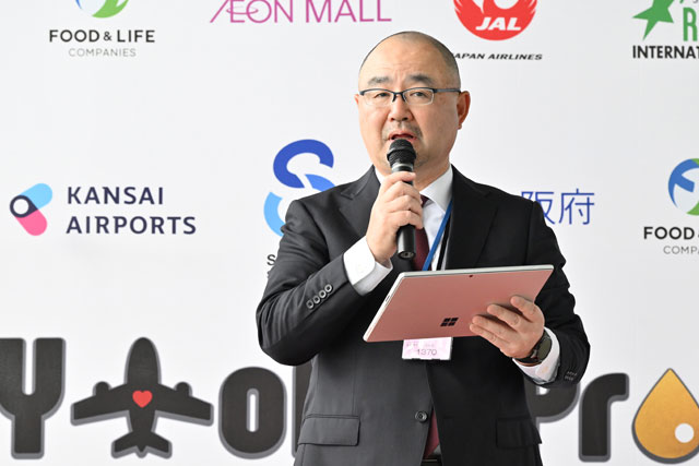 関空で挨拶するFry to Fly Project事務局の秋鹿正敬・日揮HD専務執行役員TCO=25年5月1日 PHOTO: Tadayuki YOSHIKAWA/Aviation Wire