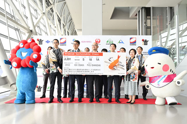 関空で国産SAFの本格運用初便となった上海行きJL891便の前で記念撮影に応じるFry to Fly Project参加各社の出席者=25年5月1日 PHOTO: Tadayuki YOSHIKAWA/Aviation Wire