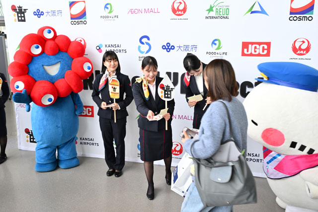 関空で国産SAFの本格運用初便となった上海行きJL891便の乗客にステッカーを手渡すJALの地上係員=25年5月1日 PHOTO: Tadayuki YOSHIKAWA/Aviation Wire