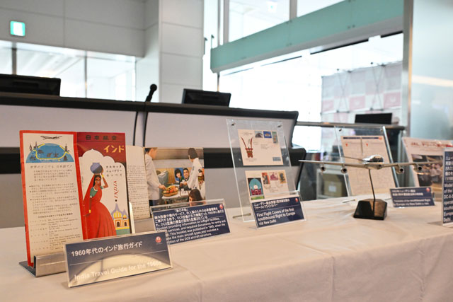 羽田第3ターミナル114番搭乗口に展示されたデリー直行便就航当時の史料=25年5月4日 PHOTO: Tadayuki YOSHIKAWA/Aviation Wire