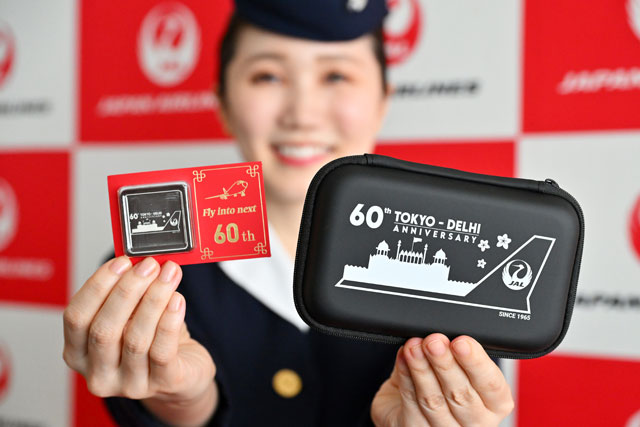 日本航空(JAL/JL、9201)は5月4日、デリー線就航60周年を記念したイベントを羽田空港で開いた。デリー行きJL39便が出発する第3ターミナルの114番搭乗口では、就航当時の3代目制服を着用した客室乗務員らが乗客に記念品のモバイルアクセサリーケースをプレゼントした。