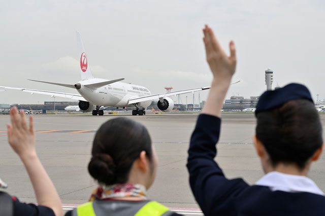 羽田空港でデリー行きJL39便を見送るJALの客室乗務員とグランドスタッフ=25年5月4日 PHOTO: Tadayuki YOSHIKAWA/Aviation Wire