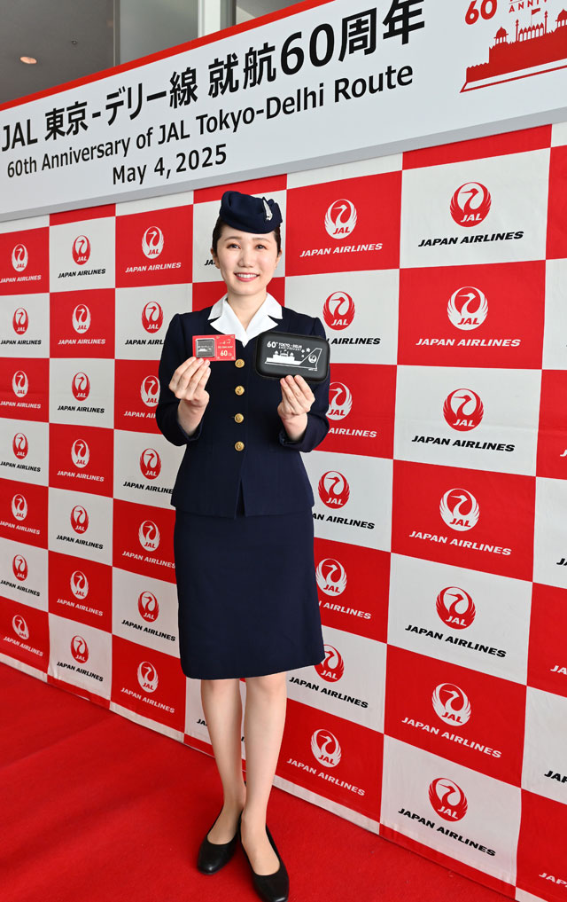 羽田空港でデリー就航60周年の記念品モバイルアクセサリーケース(右)と機内で1週間提供されるチョコレートを手にする3代目制服を着用したJALの客室乗務員=25年5月4日 PHOTO: Tadayuki YOSHIKAWA/Aviation Wire