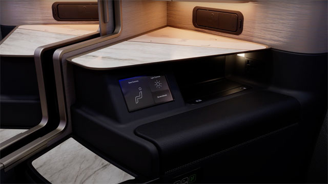 ポラリス・スタジオは、オットマン付きのリクライニングシートに加え、ドアの設置によりプライバシー性を高めた仕様とした。全席に27インチの4K有機ELモニターを搭載する。機内ではオセトラキャビアのアミューズブーシュや、シャンパンなどを提供するという。