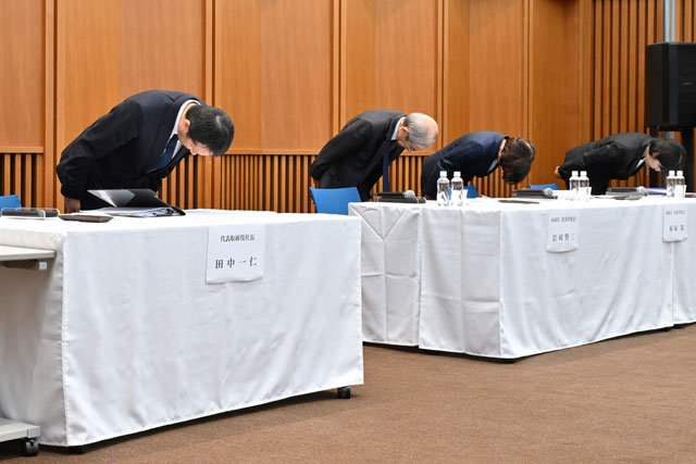 都内で開いた会見で謝罪する日本空港ビルデングの田中一仁新社長(左)と特別調査委員会の委員=25年5月9日 PHOTO: Tadayuki YOSHIKAWA/Aviation Wire
