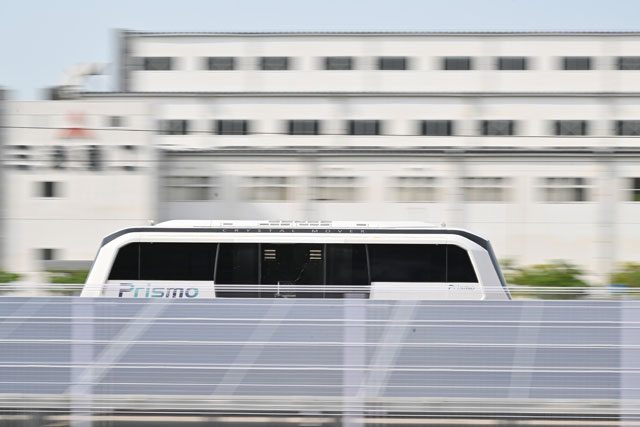 Prismoは、停車中の駅で車体に搭載したバッテリーに急速充電し、駅間約2キロメートルを最高時速80キロで走行する次世代型AGT。車両の誘導方式には、従来の車体両側にレールを設ける「サイドガイド方式」ではなく、車体下中央に1本のレールを配する「センターガイド方式」を採用し、軌道構造物をスリム化した。
