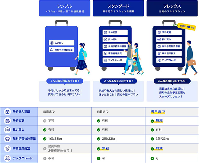 「フレックス」はスタンダードの上位にあたる運賃で、搭乗日当日まで購入可能で、空席待ちのほか、予約便の変更も無料でできる。「シンプル」はオプションを最小限に抑えた運賃で、予約変更やアップグレードの不可などの制限を設け、座席指定は出発24時間前から受け付ける。購入は搭乗前日まで。