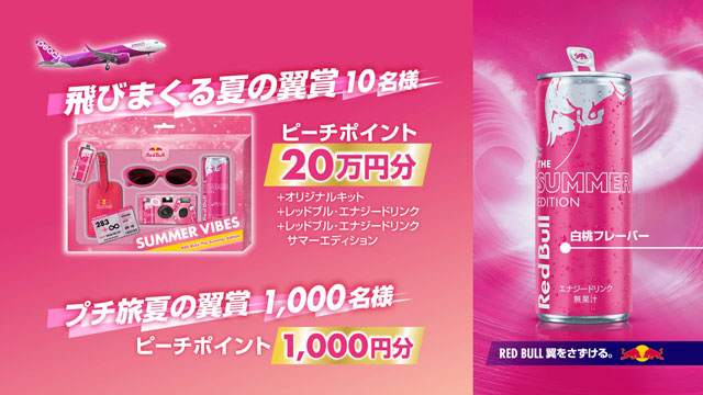同キャンペーンは、A賞として20万円分の「ピーチポイント」と、オリジナルキット(インスタントカメラ、サングラス、ステッカー、ラゲッジタグ)、レッドブル・エナジードリンク4缶キット(通常版とサマーエディション)を抽選で10人にプレゼント。B賞はピーチポイント1000円分で、1000人に当たる。ピーチポイントは、ピーチの航空券購入に利用できる。