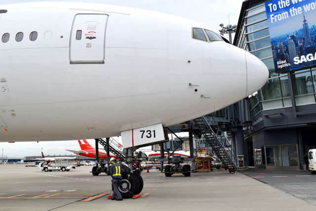 羽田空港へ到着したJAL 777-300ER初号機JA731J最終便上海発JL80便の貨物ドアを閉めるJALのスタッフ=25年5月27日 PHOTO: Tadayuki YOSHIKAWA/Aviation Wire