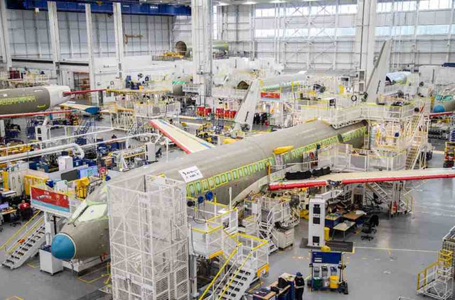 カナダ・ミラベルの最終組立工場で製造されるニューギニア航空向けA220-100初号機(エアバス提供)