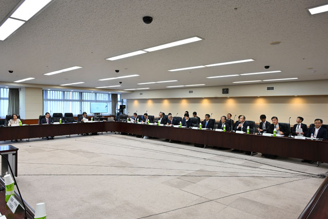 国交省で開かれた「国内航空のあり方に関する有識者会議」の初会合で挨拶する航空局の平岡成哲局長(右)=25年5月30日 PHOTO: Tadayuki YOSHIKAWA/Aviation Wire