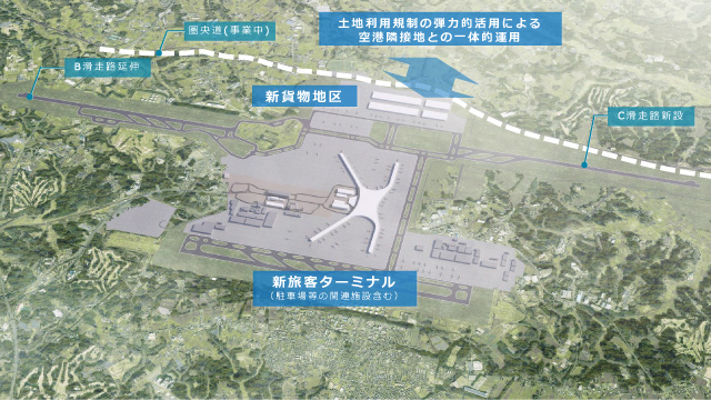 成田空港では第3滑走路(C滑走路)の建設が進んでおり、2029年3月末に供用開始を予定。年間発着回数が現在の最大30万回から20万回増の同50万回に拡大する。その後は現在3つある旅客ターミナルを新ターミナルに集約する「ワンターミナル」とする計画で、候補地は現在の第2ターミナル南側としている。