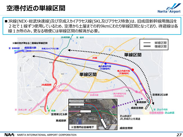 複線化を検討する成田空港周辺の単線区間(NAAの資料から)