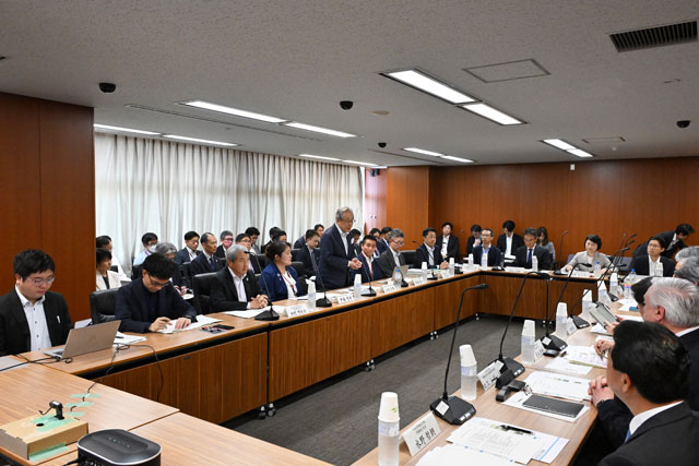国交省で開かれた「今後の成田空港施設の機能強化に関する検討会」第3回会合で挨拶する山内弘隆委員長=25年6月5日 PHOTO: Tadayuki YOSHIKAWA/Aviation Wire