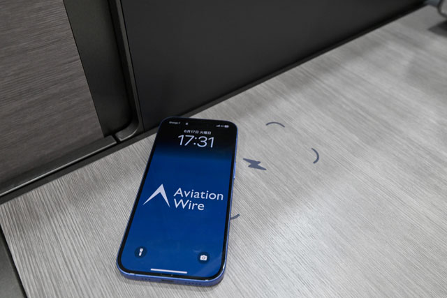 パリ航空ショーでお披露目されたANAの新個室ビジネスクラス「THE Room FX」のワイヤレス充電機能=25年6月17日 PHOTO: Tadayuki YOSHIKAWA/Aviation Wire