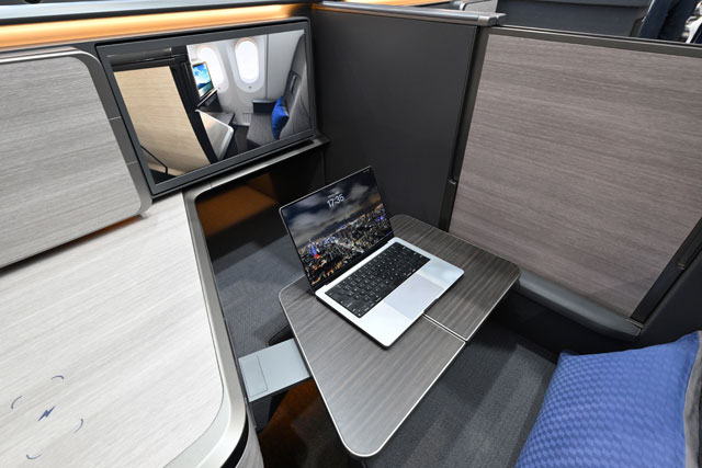 パリ航空ショーでお披露目されたANAの新個室ビジネスクラス「THE Room FX」のテーブル=25年6月17日 PHOTO: Tadayuki YOSHIKAWA/Aviation Wire