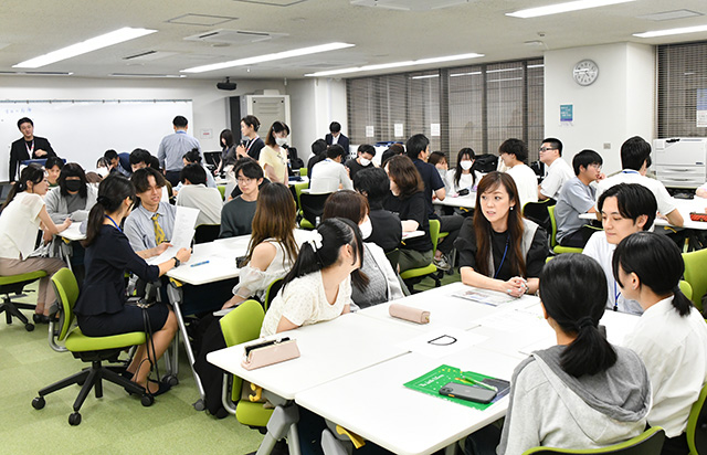 JTBツーリズムビジネスカレッジでのグループワークに参加するLOTポーランド航空のスタッフ(中央)=25年6月26日 PHOTO: Yusuke KOHASE/Aviation Wire