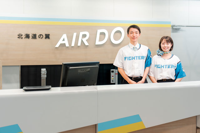 ファイターズのホームユニフォームを着用したエア・ドゥのグランドスタッフ(同社提供)