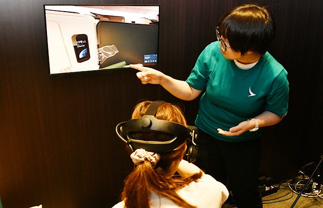 キャセイパシフィック航空の「キャセイ 夏空まつり」で提供するアリア・スイートのVR体験=25年6月27日 PHOTO: Yusuke KOHASE/Aviation Wire