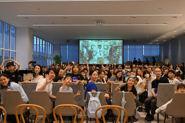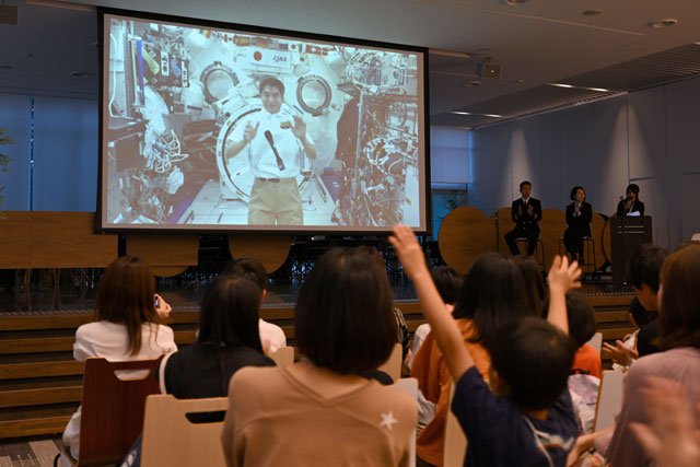 ANAブルーベースで開かれたANAの「感動!!宇宙航空教室」に参加する子供たちにISSから呼びかける大西宇宙飛行士=25年6月25日 PHOTO: Tadayuki YOSHIKAWA/Aviation Wire