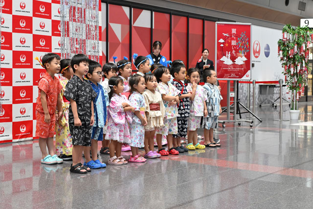 また、空港内にある保育園「アンジュ保育園」の園児が浴衣を着て訪れ、合唱を披露。「笹の葉さらさら」で始まる『たなばたさま』、『きらきらぼし』、『アイスクリームのうた』の3曲を歌い、利用客や園児の保護者とみられる人たちが聞き入っていた。