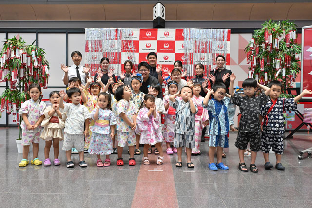 羽田空港でJALが開いた七夕イベントに参加したアンジュ保育園の園児とJAL社員ら=25年7月7日 PHOTO: Tadayuki YOSHIKAWA/Aviation Wire
