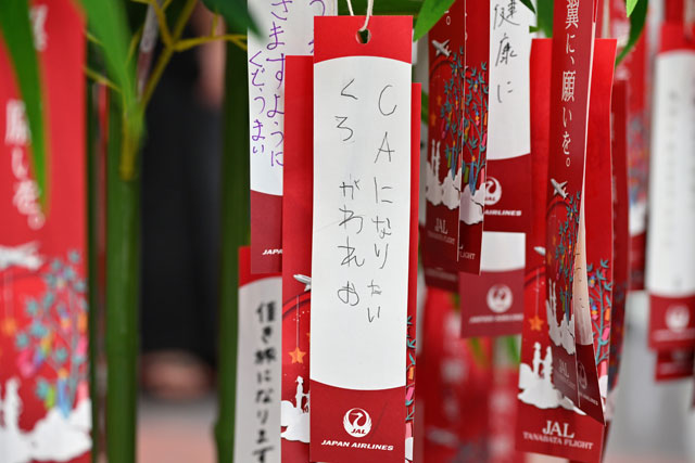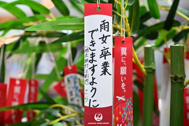 七夕の7月7日、日本航空(JAL/JL、9201)は羽田空港第1ターミナルで七夕イベントを開いた。パイロットや客室乗務員、グランドスタッフ(地上旅客係員)、整備士、グランドハンドリング係員が制服や浴衣姿で出迎え、利用客が願いごとをしたためた短冊を笹に飾り付けた。