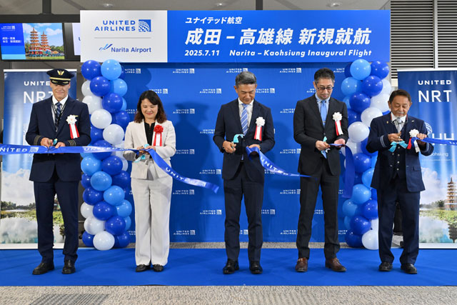 成田空港で開かれた高雄線就航式典でテープカットするユナイテッド航空の桐山謙一アジア・太平洋地区営業担当支社長(中央)ら=25年7月11日 PHOTO: Tadayuki YOSHIKAWA/Aviation Wire