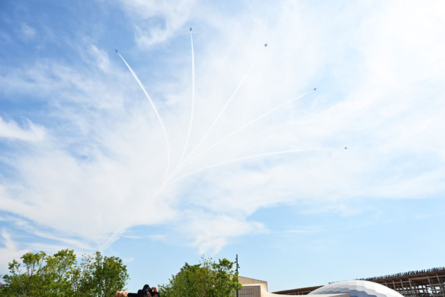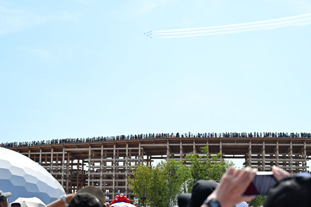 6機編隊で会場上空に進入後は、白いスモークで5本の線を描きながら、「大屋根リング」上空を通過。再び会場上空へ戻ると、ハートなどをスモークで次々と描き、午後3時の時点で気温が31度に達した会場に集まった人々からは歓声と拍手が沸き起こり、約15分間の展示飛行を終えて関空へ戻っていった。