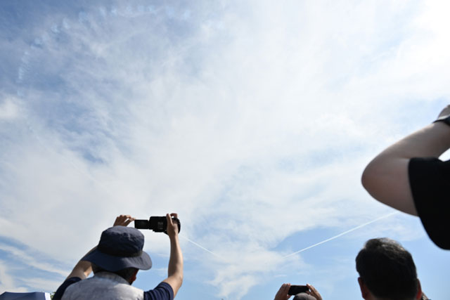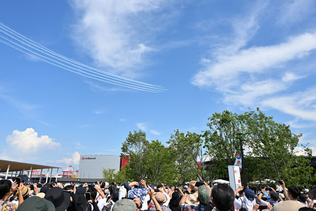 大阪・関西万博会場の上空で7月12日、航空自衛隊のアクロバット飛行チーム「ブルーインパルス」が展示飛行を披露し、雲が多いながらも青空に恵まれた会場を訪れた人たちからは歓声が上がった。あす13日も展示飛行を予定している。