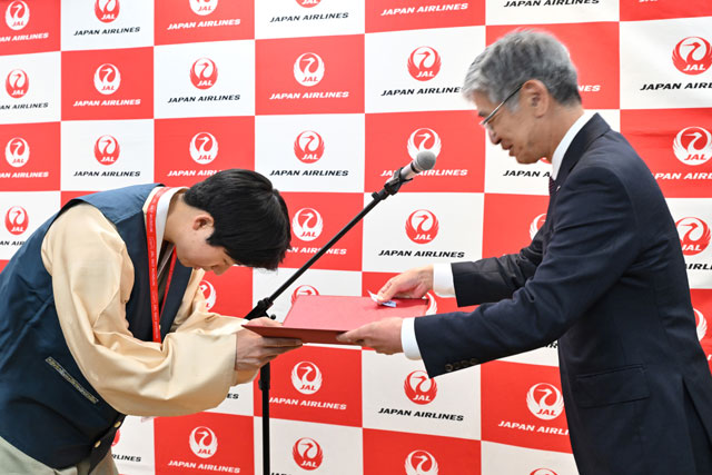 スカラシッププログラムの修了式でJAL財団の赤坂理事長から修了証書を手渡されるウチャンさん=25年7月15日 PHOTO: Tadayuki YOSHIKAWA/Aviation Wire