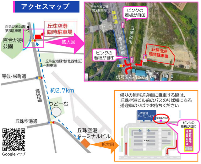 札幌丘珠空港に7月15日、臨時駐車場が開設された。10月15日午後9時まで。札幌市が空港内にある駐車場の混雑緩和の実証実験として実施するもので、昨年より期間を1カ月延長し、空港までの無料送迎車を運行する。