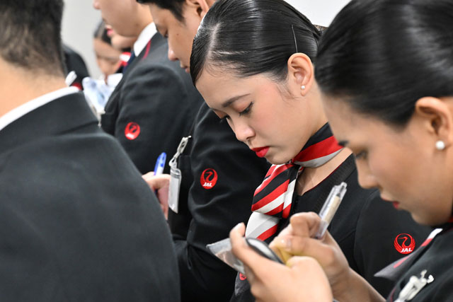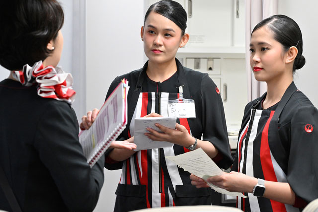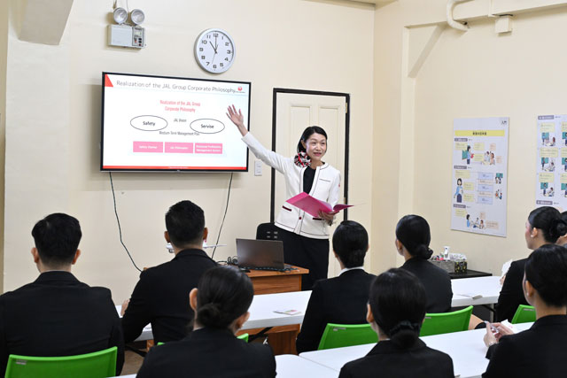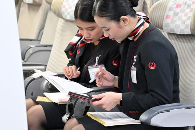 今年1月に入社した1期生たちは、マニラで基礎知識を学んだ後、羽田空港にあるJALの訓練施設で実務訓練を受けた。乗務で必要になる日本語や、接客、安全、身だしなみなど多岐にわたる内容だが、1期生たちは訓練の間もお互いに気づいた点を指摘しあい、明るい雰囲気でありながらも常に真剣なまなざしで挑んでいた。
