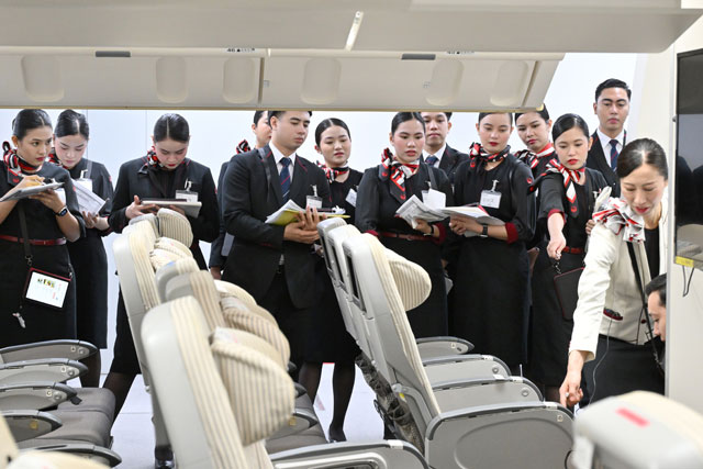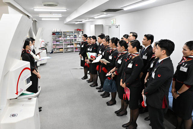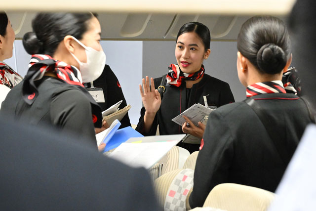 インストラクターたちが最初に1期生たちの知識を確認して訓練がスタート。客室乗務員が機内に入って最初に行うセキュリティチェック、1期生の中で乗客役と客室乗務員役に分かれての搭乗から離陸、ミールサービス(機内食の提供)、機内販売、降機と、場面ごとに訓練が進められていった。