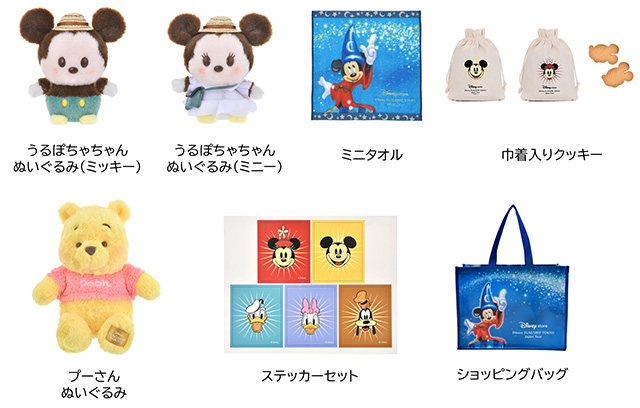 成田第2ターミナルで開催される「ディズニーフラッグシップ東京ジャパンツアー」で販売する(左上から)「うるぽちゃちゃん」のぬいぐるみ2種、ミニタオル、巾着入りクッキー、プーさんぬいぐるみ、ステッカーセット、ショッピングバッグ(NAA提供)