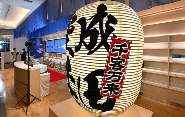 空間演出には、日本の伝統的な意匠を取り入れた。提灯には300年にわたり受け継がれてきた手描き文字の技と光の演出を施し、長暖簾にはグラデーションで風の揺れや空間の柔らかさ、奥行きを表現。日よけ暖簾には吉祥文様の「エ霞」「青海波」「麻の葉」を配置し、パンフレットラックには「厄除け」や「大漁」を意味する網代文様を採用した。イベント什器は三升紋をモチーフに成田ゆかりの文様を立体的に表現している。